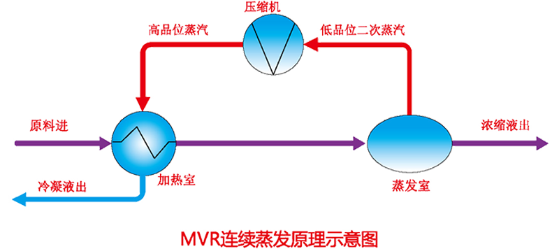 1、工作原理:MVR蒸發器工作原理是將蒸發器原本需要用冷卻水冷凝的二次蒸汽,經壓縮機壓縮后提高其壓力和飽和溫度,增加焓值,再送入蒸發器加熱器作為熱源來加熱料液,由于重新利用它自身產生的二次蒸汽的能量,從而減少對外界能源需求,達到節能。